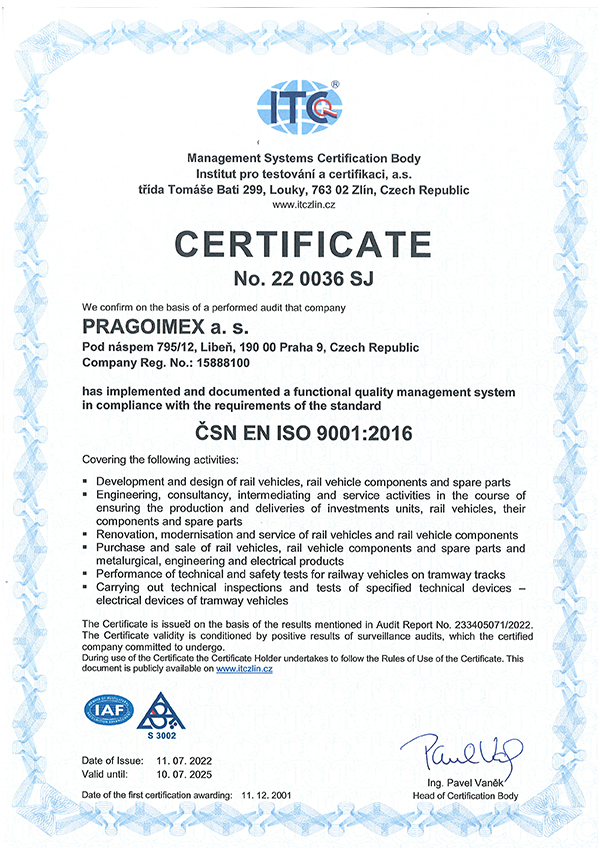 It is certified subject to international quality standards and manages built-in, documented and implemented Quality Management System according to ČSN EN ISO 9001:2016 standard.