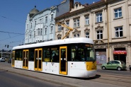 Четырëхосный односторонний низкoпольный трамвайный вагон, с четырьмя дверями, полностью поворотными тележками ификсированными осями, электрооборудованием сIGBT инверторами с рекуперацией и кондиционером салона для пассажиров.